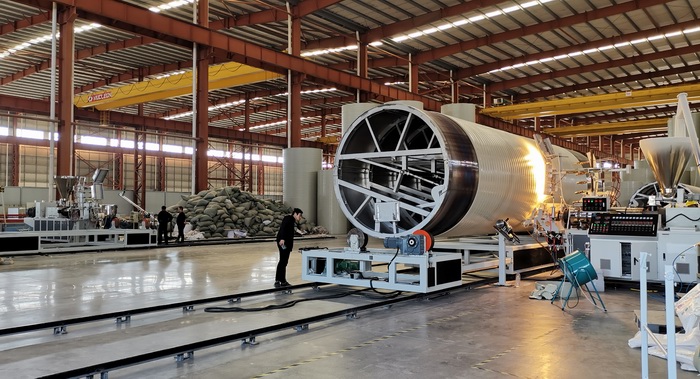 我們引進消化法國著名公司的先進技術及工藝,并通過自行研制及開發出適合我們國情的擠出纏繞無焊縫塑料儲罐生產線。產品已在國內多家企業使用。該生產線自動化層度高,控制簡單有效。整條生產線操作維護保養簡單,節約勞力,能耗底,無須明火加熱等。